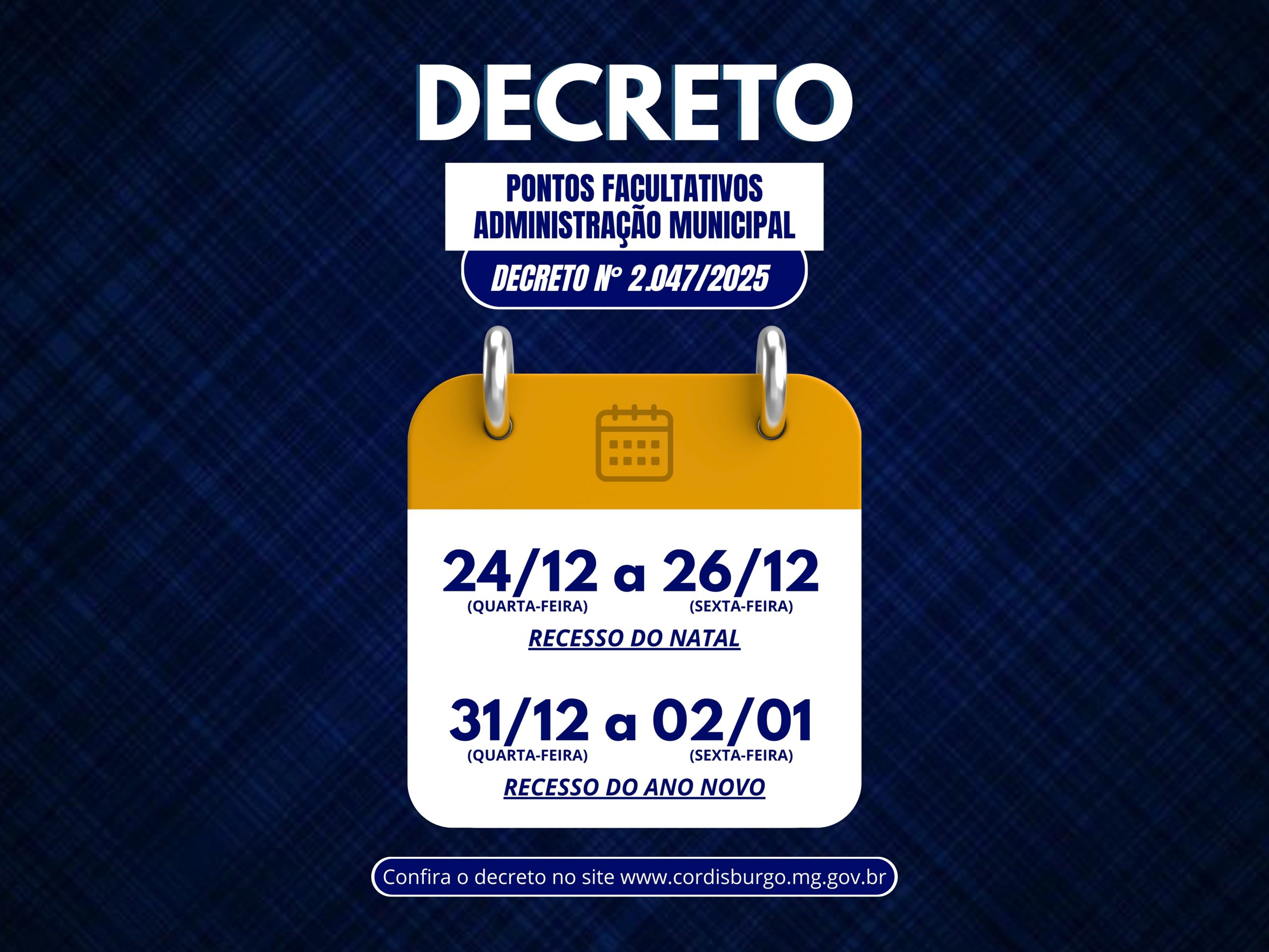 A Prefeitura Municipal de Cordisburgo informa que foi publicado o Decreto nº 2.047/2025, que institui ponto facultativo no âmbito da Administração Pública Municipal direta durante o período de festas de fim de ano.